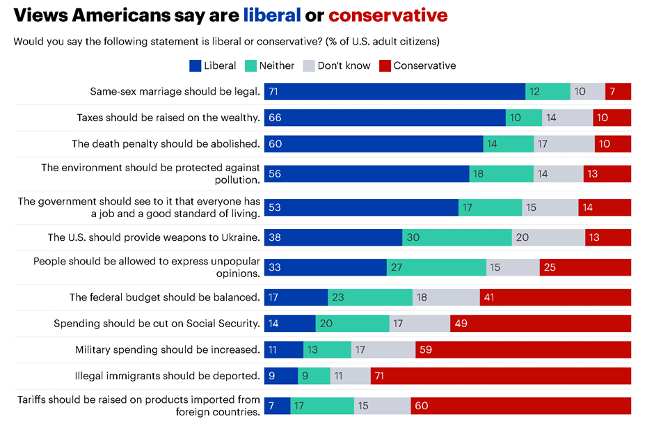 Amerikiečiai aiškiai mano, kad tos pačios lyties santuokos yra liberali politika – kaip ir didesni mokesčiai turtingiems. Kita vertus, nelegalių imigrantų deportacija ir išlaidų socialinei apsaugai karpymas yra konservatyvios nuostatos (bent jau pagal apklausą).