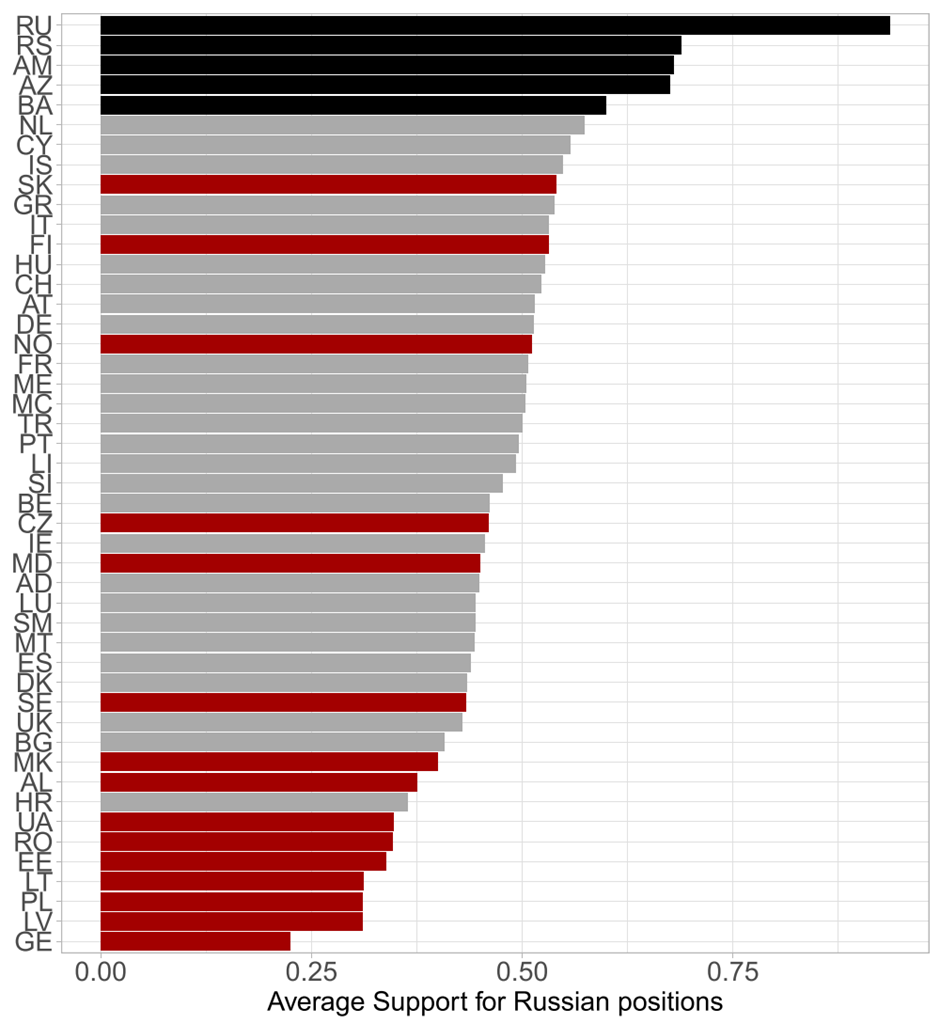 Grafike matome visų ETPA narių delegacijas, suskirstytas pagal tai, kiek vidutiniškai jos paremdavo Rusijai palankią poziciją. Raudonai pažymėtos valstybės, kurios dėl geografinių ar istorinių priežasčių yra jautrios Rusijos grėsmei. Juodai pažymėtos šalys, kurios tradiciškai yra draugiškos Rusijai. Pilkos yra valstybės, kurioms Rusija gal ir nėra grėsmė.
