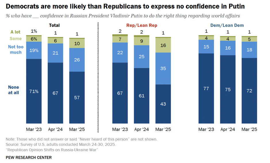 Ir šis sumažėjimas vyko išskirtinai tarp respublikonų rinkėjų. 2025 m. jau tik 43 % jų visiškai nepasitikėjo ruzzijos lyderiu.